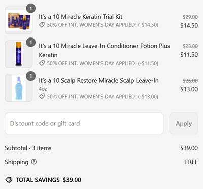 Sale-abrate International Women’s Day with savings at It’s A 10! Take 50% OFF sitewide, including value sets, for a LIMITED TIME ONLY! Restock the bestselling Original Miracle Leave-in or tame that mane with HALF OFF the newest Clear Miracle Leave-in! Reduce frizz, restore shine, and detangle with this crystal clear, lightweight formula!