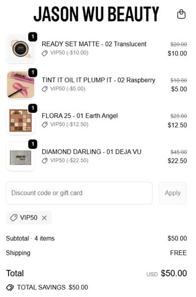 Use the Jason Wu Beauty coupon code VIP50 (click to copy) to add the discount to cart. FREE SHIPPING applies to orders $50+. Exclusions may apply. Take a look at our other favorite finds!