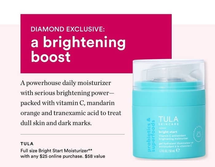 JUST ADDED Besties! Ulta Beauty Perks Day for Diamond and Platinum members is here! You must be signed into your account to see the exclusive offers reflected in cart. We’ve got FULL SIZE gifts with purchase from brands like Dermalogica, Joico, Juice Beauty, Kinship, and more! Diamond members check your e-mail for your unique code for a FREE FULL SIZE TULA Bright Start Vitamin C Antioxidant Brightening Moisturizer with any $25 purchase, a $58 value, with any $25 purchase!