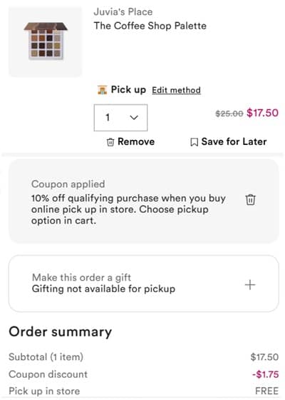 Activate any points multiplier offers you may have available to you. FREE SHIPPING for Ulta Beauty Rewards Credit Card purchases or orders $25+ for Diamond members and $35+ for everyone else. OR choose BOPIS and save 10% OFF your buy online pick up in store orders using the coupon code PICKUP10 (click to copy) if available in your area (includes prestige and fragrance). Check out our other favorite Ulta Beauty finds!