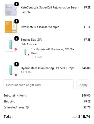 No code needed, add the HydraKate Drops to cart and you will be prompted to add the second FREE. Don’t forget to add your FREE samples. FREE SHIPPING applies automatically at checkout. Take a look at our other favorite finds!