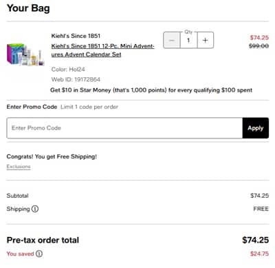 It gets better! You’ll receive a FREE FULL SIZE Shave Cream, a $24 value, with any $125 Kiehl’s purchase PLUS $10 in Star Money (that’s 1,000 points) with every qualifying $100 spent! Take a look at our value breakdown below to help you decide if the Kiehl’s Advent Calendar 2024 is worth adding to cart!