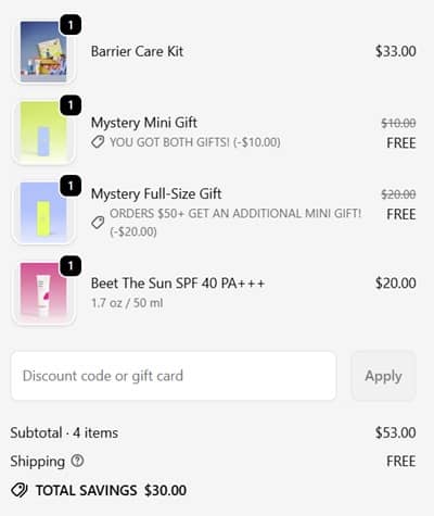 No code needed. The KraveBeauty FREE full size and mini gifts with purchase will add once your order qualifies. FREE SHIPPING applies to orders $50+. Take a look at our other favorite finds!