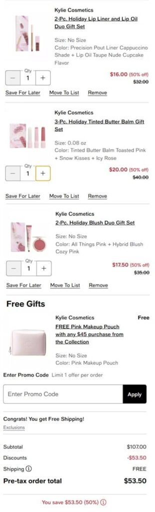 At HALF OFF add all 3 to cart PLUS enjoy a freebie! Take 50% OFF select KYLIE Cosmetics Holiday Sets at Macy’s! PLUS receive a FREE Pink Signature Makeup Pouch with any $45 brand purchase! Stock up on a hydrating bestseller, the Holiday Tinted Butter Balm Trio! 3 FULL SIZE faves, regularly $20 EACH, you’ll get the whole set for only $20! C heck out our example cart below!