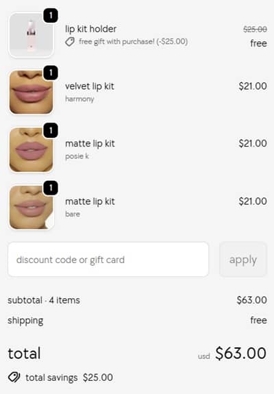 No code needed, KYLIE Cosmetics Matte & Velvet Lip Kits are priced as marked. You will be prompted to add the FREE gift with purchase once your order qualifies. FREE SHIPPING applies to all orders $40+. Take a look at our other favorite finds!