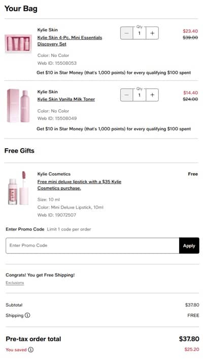 Calling all of our skincare lovers! Pull out that wish list! For a LIMITED TIME ONLY save 40% OFF KYLIE Skin at Macy’s! It gets better! You’ll receive a FREE Mini Deluxe Lipstick with any $35 KYLIE Cosmetics purchase PLUS $10 in Star Money (that’s 1,000 points) with every qualifying $100 spent!