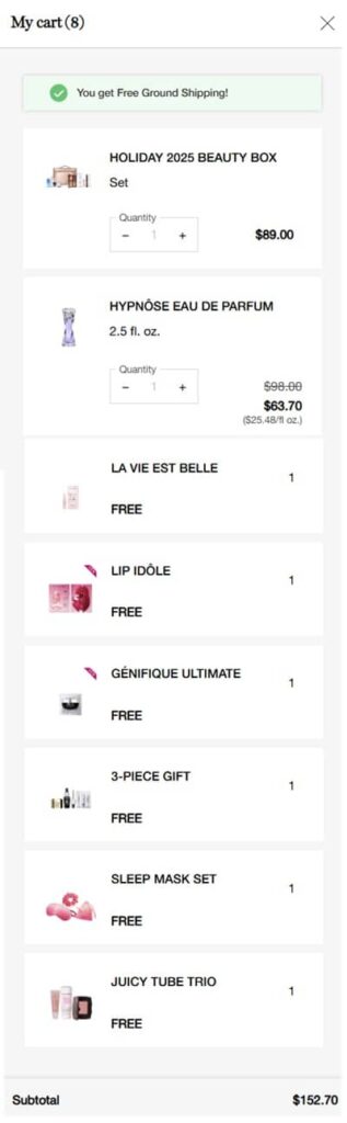 It’s back! Score the 2025 Holiday Beauty Box, a $534 value, for only $89 with any $42 purchase WHILE SUPPLIES LAST! Included inside: the Idôle Café Crush Eyeshadow Palette, FULL SIZE Bi-Facil Eye Makeup Remover, FULL SIZE Crème Radiance Cleanser, FULL SIZE Génifique Ultimate Serum, and so much more! Take a look at our example cart below!