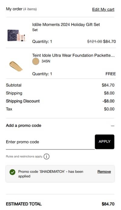 No code needed, priced as marked. Use the coupon code SHADEMATCH (click to copy) to choose a FREE Teint Idole Ultra Wear Foundation Packette Sample. My Lancôme Rewards members (free to join) receive FREE SHIPPING on orders $49+, non-members receive free shipping on orders $100+. Take a look at our other favorite finds!