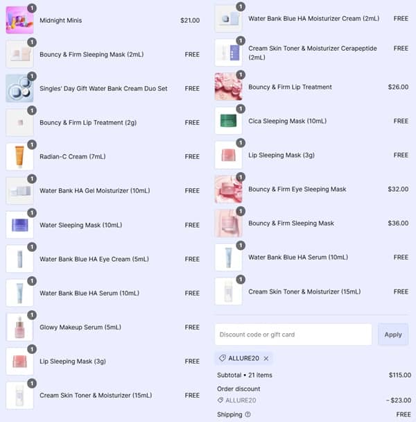 This is such a great deal! Thank you! I love Laneige! I was actually in the process of ordering water bank cream moisturizer, but always check BFF and found this amazing deal! (I used the code ALLURE20 for an extra 20% discount!)