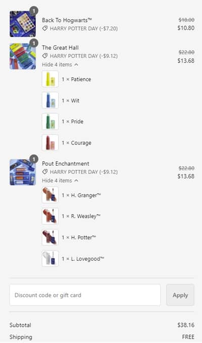 No code needed, the additional discount reflects on the ColourPop x Harry Potter Collection in cart. FREE SHIPPING applies to orders $30+. Exclusions may apply. Take a look at our other favorite finds!