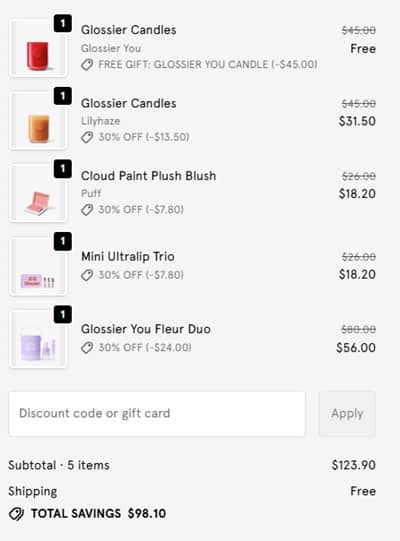 LAST DAY alert Besties! The more you buy, the more you’ll save Besties! It’s your LAST CHANCE to save 25% OFF your Glossier essentials! Step up to a $100 purchase and you’ll save 30% OFF so add your restock list to cart! PLUS orders $120+ receive a FREE Signature You Candle, a $45 value! Here’s your chance to add the newest Cloud Paint Plush Blush to your makeup routine or treat yourself to the musky floral notes in You Fleur Eau de Parfum!