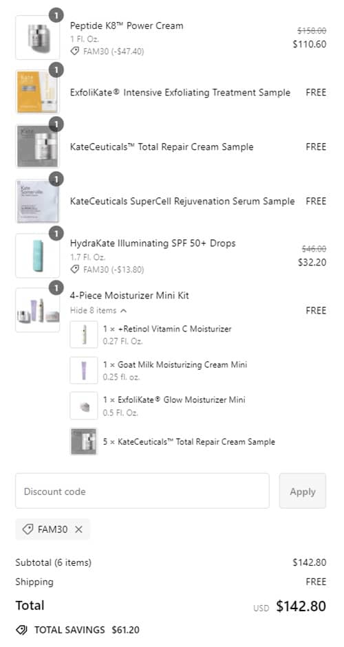 Use the Kate Somerville coupon code FAM30 (click to copy) to add the discount to cart. You will be prompted to add your FREE gift with purchase once your order qualifies. Don’t forget to add your FREE samples. FREE SHIPPING applies to orders $50+. Exclusions may apply. Take a look at our other favorite finds!