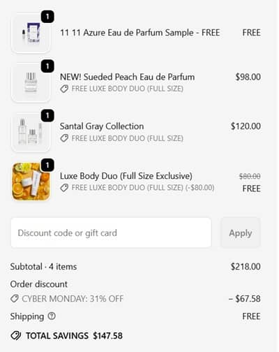 Your signature scent is waiting! Grab it for less but not for long! Today is the LAST DAY to save 31% OFF eau de parfum, candles, oils, and more during the Lake & Skye Cyber Sale Event! To make the deal even sweeter receive a FREE FULL SIZE Luxe Body Duo, a $146 value, with any $145 purchase!