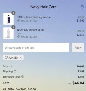 Use the Navy coupon code JUNE53 (click to copy) to add the discount at checkout. FREE SHIPPING applies to Navy Hair Care orders $75+, for orders less than $75 shipping is only $3.99. Excludes sets. Other exclusions may apply. Take a look at our other favorite finds!