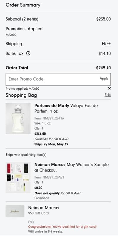 To add the promotional gift card, use the Neiman Marcus coupon code MAYGC (click to copy) at checkout with your qualifying order. Your promotional gift card and redemption instructions will be sent within 5-6 weeks of the promotion expiration date via the email address used when placing the order. The card expires within 90 days of the issue date indicated on the award email.