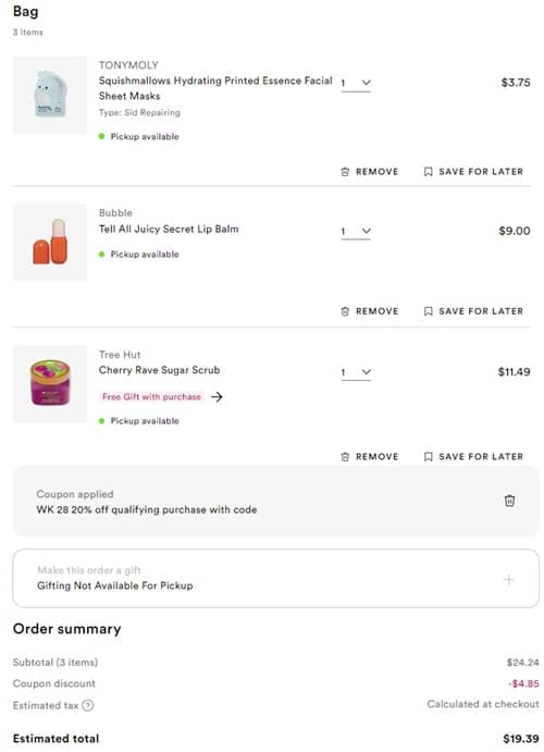 Add to cart Besties because this deal is going, going, almost gone! Today is the LAST DAY to save 20% OFF your Ulta Beauty non prestige purchase using the code below! Save on faves from brands like Bubble, The Ordinary, Naked Sundays, e.l.f. Cosmetics, and so many more! PLUS be sure to add on the FREE Member Exclusive 26 Piece Beauty Bag with any $75 purchase (3 options) if your order qualifies!