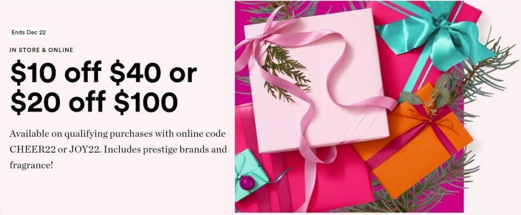 - CHEER22 save $10 OFF $40+ purchase including prestige and fragrance.