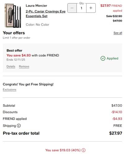 If you’ve been eyeing this set, today’s the day to add to cart! Score the Laura Mercier Caviar Cravings Eye Essentials Duo for only $27.97 with FREE SHIPPING at Macy’s! This classic duo includes a FULL SIZE Caviar Extravagant Mascara and a FULL SIZE Caviar Tightline Eyeliner, regularly $29 EACH! Enjoy both longer, fuller lashes and a long-wear, smudge-proof eyeliner for less than the regular price of 1!