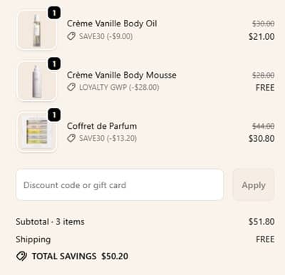All orders save 30% OFF! Add 3 items to cart to save 35% OFF, add 4+ items to cart and you’ll save 40% OFF! Find what your collection is missing! From the yummy Fruit du Dragon Fresh Mist to the coconut, bergamot, and warm vanilla praline notes in everyone favorite Lait de Coco Eau de Parfum!