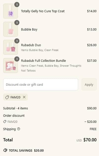 Use the Lights Lacquer coupon code FAM20 (click to copy) to add the discount to your cart. FREE SHIPPING applies to orders $60+. Select shades only. Excludes nail care, nail art, tools, and bundles. Other exclusions may apply. Take a look at our other favorite finds!