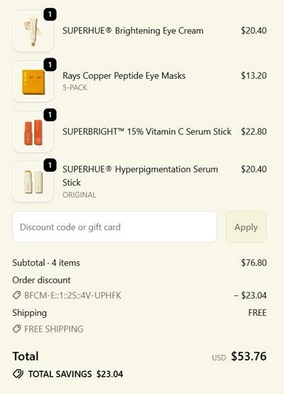 Stacking savings for the win! For a LIMITED TIME ONLY save 40% OFF select Live Tinted Cyber Monday skincare must haves PLUS enjoy an ADDITIONAL 30% OFF! Tackle tone and texture with the fan fave SUPERBRIGHT 15% Vitamin C Serum Stick! This multi-tasker even targets fine lines and wrinkles, regularly $38, add yours to cart for only $15.96!