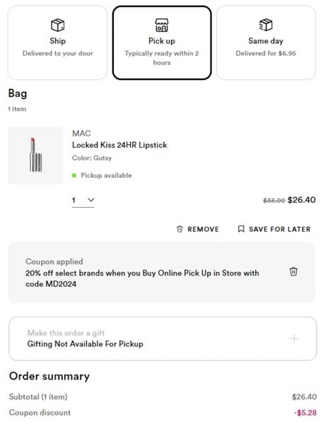 Discover your new signature lip with these iconic favorites! Take 20% OFF select MAC Cosmetics lipsticks, lip gloss, lip liner, and more PLUS use the code below for an additional 20% OFF when you choose BOPIS at Ulta Beauty! Take a look at our example cart below! Be sure to add the freebies listed below if your order qualifies!