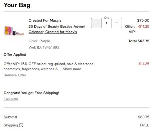 Use the Macy’s coupon code VIP (click to copy) to add the discount to cart. Macy’s Star Rewards members (free to join) enjoy FREE SHIPPING on orders $25+ or choose FREE in store pick up if the items are available in your area. Take a look at our other 2024 Advent Calendar value breakdowns!