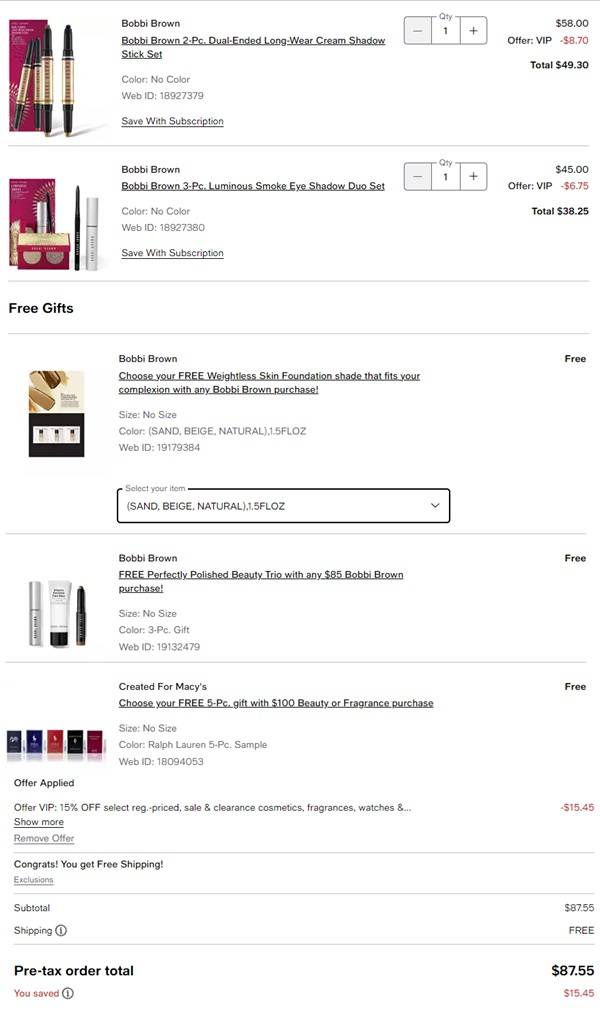 Besties! Today is the day to take advantage of these stacking offers! Star Rewards Members (free to join) earn $10 in Star Money (that`s 1,000 points) for every $40 spent on Bobbi Brown! PLUS you’ll save 15% OFF using the code below! To make the deal even sweeter, the freebies below are available with your qualifying order: