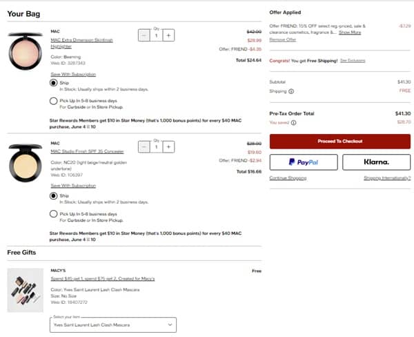 Don’t miss out on the select MAC Cosmetics items that are already on sale for 30% OFF PLUS an additional 15% OFF PLUS receive $10 in Star Rewards Bonus Points with $40 purchase! Spend $45 and you’ll choose 1 FREE mini, orders $75+ choose 2! Check out our example cart below!