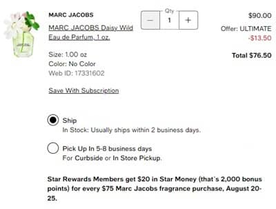 Besties! Today is the LAST DAY to advantage of these stacking offers! Discover your new signature scent! Star Rewards Members (free to join) earn $20 in Star Money (that`s 2,000 points) for every $75 spent on Marc Jacobs fragrance! PLUS you’ll save 15% OFF! To make the deal even sweeter, you’ll receive a FREE 5 Piece Gift with any $150 Beauty or Fragrance purchase!