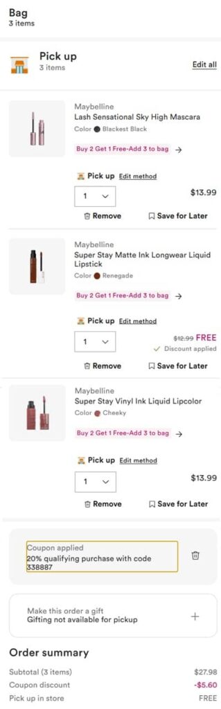 Activate any points multiplier offers you may have available to you. Use the coupon code 338887 to save 20% OFF your non-prestige purchases or 815510 to save $5 OFF your non-prestige purchases $15+ (exclusions apply*). FREE SHIPPING on orders $25+ for Diamond members and $35+ for everyone else. You can also choose Buy Online, Pick Up In Store (BOPIS) where available. Check out our other favorite Ulta Beauty finds!
