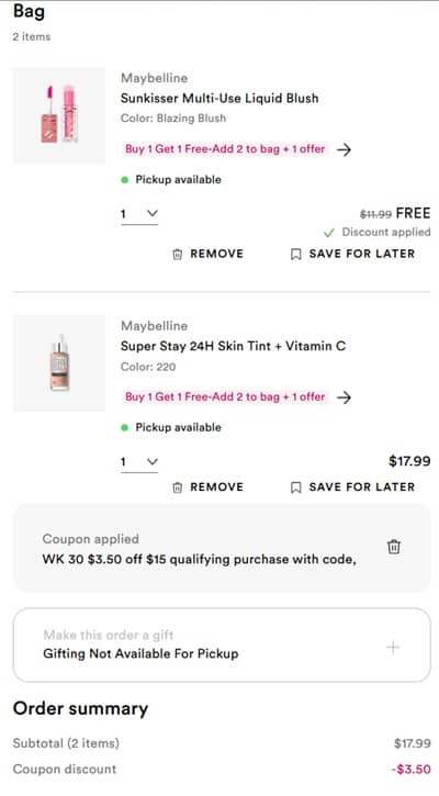 Add 2 eligible Maybelline items to cart and the lowest priced one will become FREE. Use the Ulta Beauty coupon code 733284 (click to copy) to save $3.50 OFF your qualifying non prestige purchase of $15+ (exclusions apply). Activate any points multiplier offers you may have available to you. FREE SHIPPING for Diamond & Platinum members when purchasing any Ulta Beauty 21 Days of Beauty Steal. Otherwise, FREE SHIPPING applies on orders $25+ for Diamond members and $35+ for everyone else or choose to buy online, pick up in store if available in your area. Check out our other favorite Ulta Beauty deals!