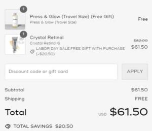 No code needed, items are priced as marked. The FREE Medik8 gift with purchase will add to cart with qualifying order. FREE SHIPPING applies to orders $60+. Excludes sets and travel sizes. Other exclusions may apply. Take a look at our other favorite finds!