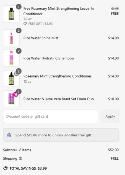 - FREE Rosemary Mint Strengthening Leave-in Conditioner ($3.99 value) with any $50 purchase