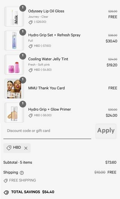 Use the Milk Makeup coupon code HBD (click to copy) to add the discount to cart. The FREE gift with purchase will add once your order qualifies. FREE SHIPPING applies to orders $50+. Excludes Blur Stick, sets, and already discounted items. Other exclusions may apply. Take a look at our other favorite deals!