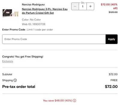No code needed, eligible Narciso Rodriguez fragrance sets priced as marked. The FREE gift with purchase will add to cart once your order qualifies. Sign in to your Macy’s Star Rewards account (free to join) for FREE SHIPPING on orders $25+ or choose free in store pick up if available in your area. Check out our other favorite Macy’s finds!