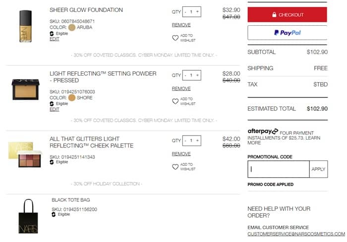 Don’t blink or you’ll miss it! For a LIMITED TIME ONLY save 30% OFF select NARS Coveted Classics! This includes bestsellers like the Sheer Glow Foundation, Afterglow Lip Balm, Highlighting Powder, AND MORE! You’ll even save 30% OFF the Holiday Collection! Orders $100+ will receive a FREE Tote with the code TOTE (click to copy)!