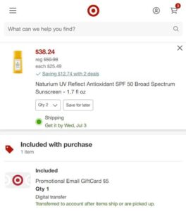 New Target Circle offer ALERT! Save 25% OFF the fan favorite Naturium UV Reflect Antioxidant SPF 50! The lightweight, sheer, skincare infused formula that provides a soft focus, velvety finish will become your new summer favorite! This sale is even included in the FREE $5 Target GiftCard with $30 Skin & Hair Care purchase offer! See our cart below!