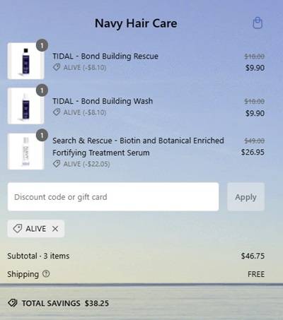 Say goodbye to bad hair days with savings and FREE SHIPPING at Navy Hair Care! For a LIMITED TIME ONLY save 45% OFF shampoo, conditioner, treatments, and more! This sale even includes value sets! Stock up on the TIDAL Bond Building Rescue and the TIDAL Bond Building Wash! Both are 50% OFF PLUS stack an ADDITIONAL 45% OFF and score these for $9.60 each before they’re gone!