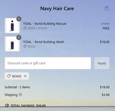 Don’t have FOMO on this hair care BOGO! Buy 1 Navy Hair Care item and get a second for FREE! From shampoo to serums, masks to thickening cream, and everything in between, stock up on your must haves while you can! Besties looking to strengthen damaged locks, check out the TIDAL Bond Building Wash and Bond Rescue Conditioner! On sale for HALF OFF PLUS stacks with the buy 1 get 1 FREE offer! Check out our example cart below!