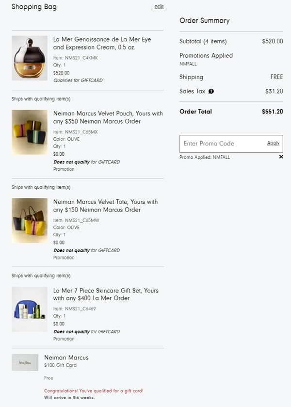 To add the promotional gift card, use the Neiman Marcus coupon code NMFALL (click to copy) at checkout with your qualifying order. Your promotional gift card and redemption instructions will be sent within 8 weeks of the promotion expiration date via the email address used when placing the order. The card expires within 90 days of the issue date indicated on the award email. FREE SHIPPING applies automatically at checkout. Exclusions may apply. Take a look at our other favorite finds!