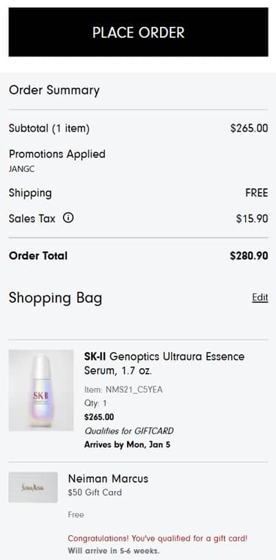 To add the promotional gift card to your qualifying order, use the Neiman Marcus coupon code JANGC at checkout. Your promotional gift card and redemption instructions will be sent within 8 weeks of the promotion expiration date via the email address used when placing the order. The card expires within 90 days of the issue date indicated on the award email.