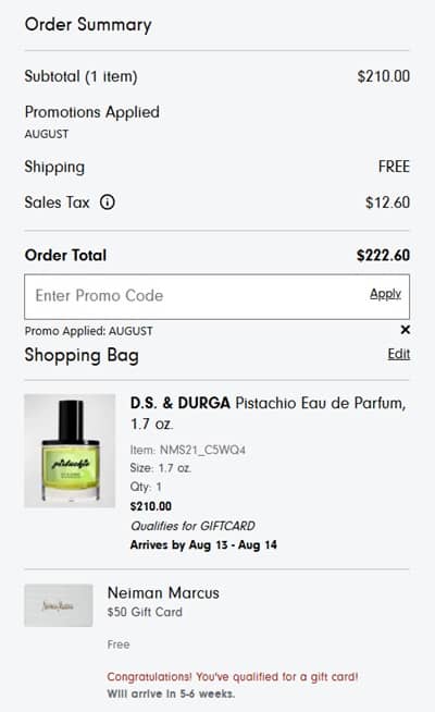 To add the promotional gift card, use the Neiman Marcus coupon code AUGUST (click to copy) at checkout with your qualifying order. Your promotional gift card and redemption instructions will be sent within 8 weeks of the promotion expiration date via the email address used when placing the order. The card expires within 90 days of the issue date indicated on the award email.