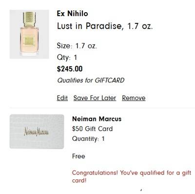 To add the promotional gift card to your qualifying order, use the Neiman Marcus coupon code NMSHOP at checkout. Your promotional gift card and redemption instructions will be sent within 8 weeks of the promotion expiration date via the email address used when placing the order. The card expires within 90 days of the issue date indicated on the award email.