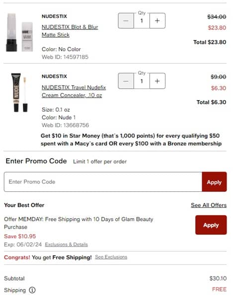 BONUS POINTS ALERT! You’ll receive $10 in Star Money for every qualifying purchase made with a Macy’s Credit Card OR every $100 with a Bronze membership (free to join)! You’ll also receive a FREE 5 Piece Gift with any $75 10 Days of Glam purchase!