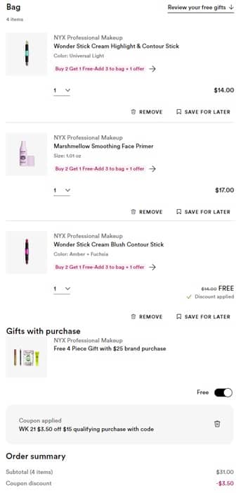 Budget friendly beauty haul alert! Buy 2 select NYX Professional Makeup Bestsellers and you’ll get a 3rd FREE at Ulta Beauty! PLUS you’ll save an additional $3.50 OFF orders $15+ with the code below! It gets better! You’ll also enjoy a FREE 4 Piece Gift with any NYX Professional Makeup order $25+! From eyebrow pencils to lippies, setting sprays to color correctors, add your faves to cart today!