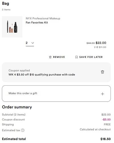 HALF OFF and FREE SHIPPING? Yes, please! Score the NYX Professional Makeup Fan Favorites Kit for only $11 with FREE SHIPPING TODAY ONLY at Ulta Beauty! This set includes 3 bestsellers: a FULL SIZE Epic Ink Waterproof Liquid Eyeliner, FULL SIZE Butter Gloss Non-Sticky Lip Gloss, and travel sized Matte Setting Spray! That’s a $26 value if purchased separately! At this price, add 2 to cart! Be sure to add on any FREE gifts with purchase your order may qualify for: