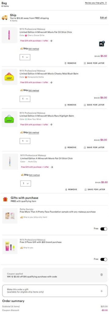 Get in creative mode and craft your summer looks today with 50% OFF savings! Take HALF OFF the NYX Professional Makeup x Minecraft Collection for a LIMITED TIME ONLY at Ulta Beauty! Even better, use the code below and orders $15+ save an additional $3.50 OFF PLUS brand orders $20+ receive a FREE 3 Piece Gift! Be sure to add on any FREE gift with purchase offers your order may qualify for: