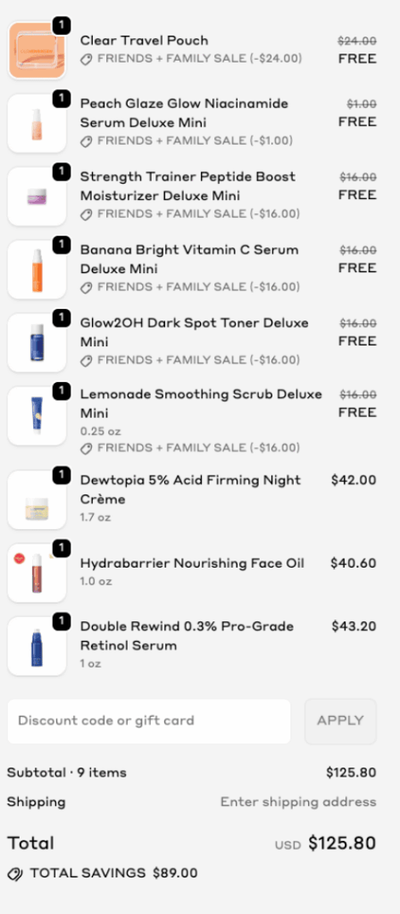- FREE 6 Piece Deluxe Mini Gift with any $125 purchase: Strength Moisturizer, Banana Bright+ Vitamin C Serum, Peach Glaze Glow Serum, Glow2Oh Dark Spot Toner, Lemonade Scrub deluxe minis PLUS Clear Travel Bag