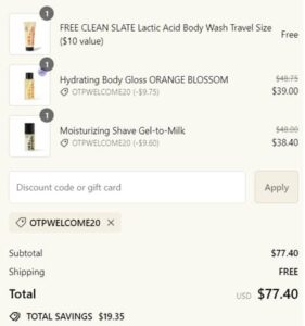 Treat yourself to a little self care Besties! Take 25% OFF your OUI the People purchase during their Summer Skin Sale Event! New customers save an additional 20% OFF when you use the code OTPWELCOME20 (click to copy) on your first purchase! Better yet, orders $50+ receive a FREE travel size Clean Slate Body Wash, a $10 value! Check out our example cart below!